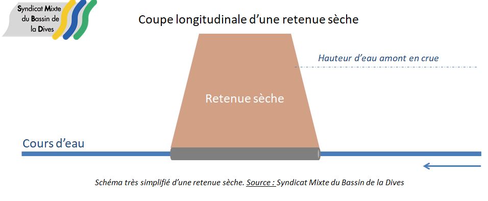 Qu'est ce qu'un "barrage écrêteur de crue" ou "retenue sèche" ? Il s'agit d'un aménagement hydraulique, placé dans le lit majeur du cours d'eau, perpendiculairement, et permettant le ralentissement dynamique des eaux via le stockage de celles-ci lors des crues (Cf. Schéma ci-dessous)